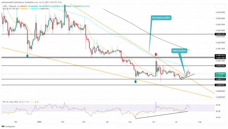 Por outro lado, se o sentimento do mercado continuar oscilando na incerteza, os vendedores de LUNC podem quebrar a linha de tendência de suporte do novo rali de recuperação. Essa quebra começaria a refletir a fraqueza no momento de alta e pode compensar a tese de alta se o preço da moeda cair abaixo de US$ 0,00008.