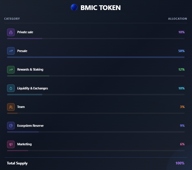 O token BMIC roda na rede Ethereum, com oferta total fixa de 1,5 bilhão de unidades, sem possibilidade de aumento. A distribuição revela as prioridades do projeto. Cinquenta por cento vão para a pré-venda, garantindo maior participação pública desde o início.