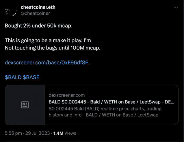 De fato, o próprio cheatcoiner obteve um lucro de US$ 1,4 milhão com BALD após um investimento inicial de $ 500.