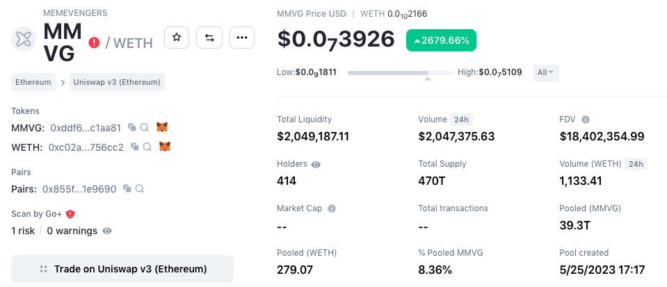A memecoin em questão recebeu o nome de Memevengers (MMVG) e não aparece em nenhum localizador de preços. Mesmo assim, isso não impediu que a rápida procura fizesse o MMVG dispara impressionantes 28.000% em apenas seis horas.