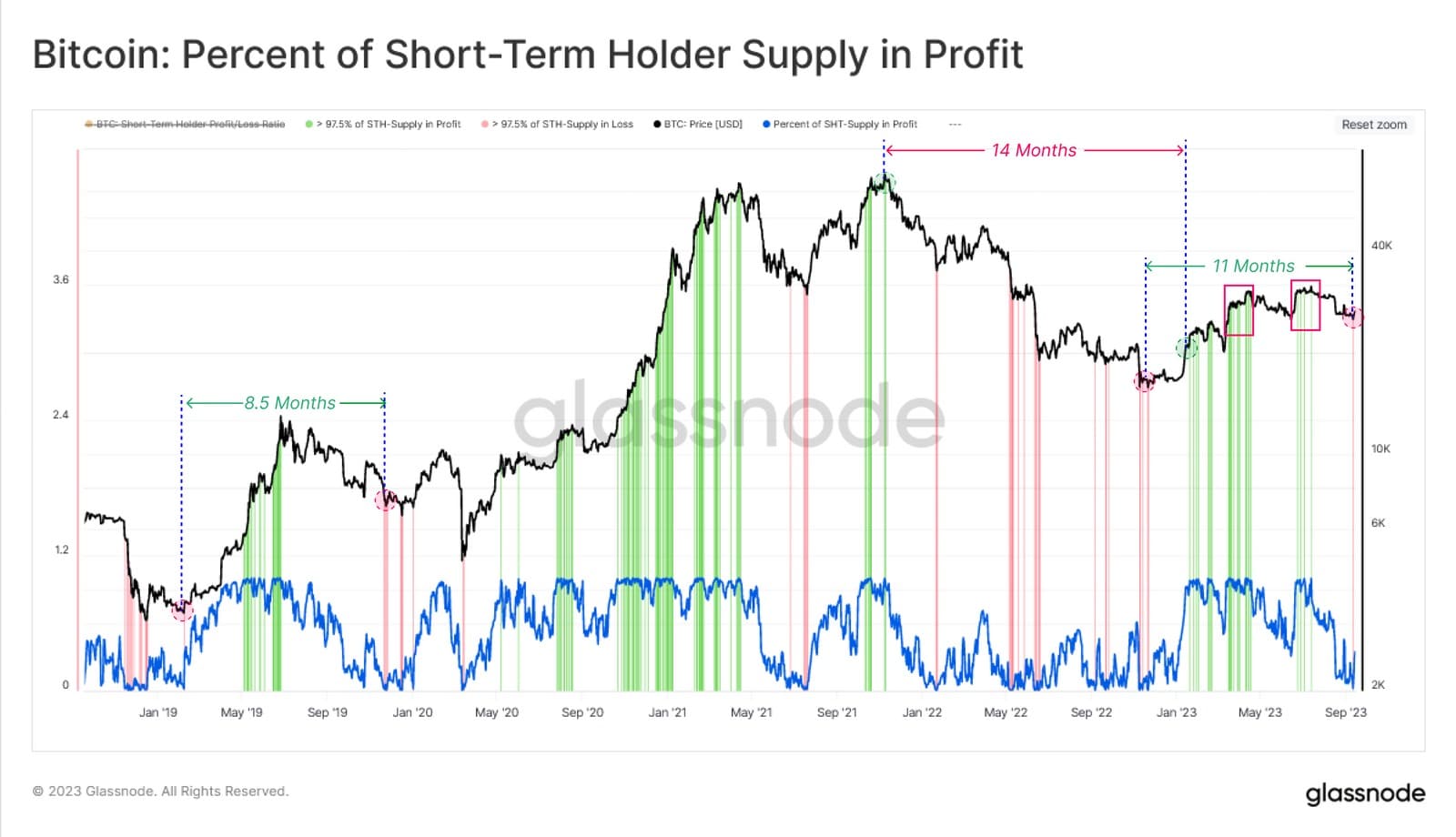 No mercado de criptomoedas, é difícil apurar um indicador que tenha 100% de acerto no sentido de prever movimentações de preço. Contudo, uma situação que ocorre em 100% das vezes em que o BTC faz fundo, de acordo com Fernando Pereira, é um percentual maior que 97,5% dos investidores de curto prazo no prejuízo.