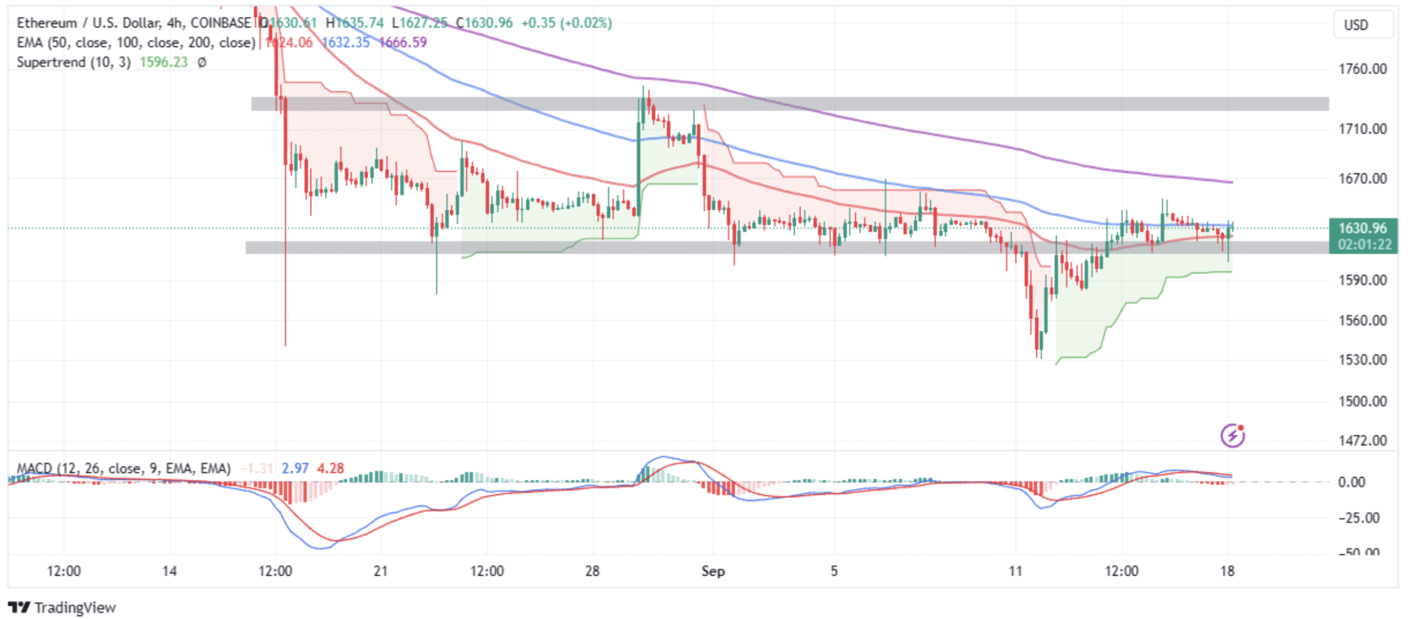 Com base no indicador Convergência Divergência de Médias Móveis (MACD), a negociação lateral pode ter precedência até que o preço do ETH enfraqueça a resistência imediata em US$ 1.632 – algo que já aconteceu. Mas é preciso acompanhar o fechamento diário antes de confirmar esse movimento.