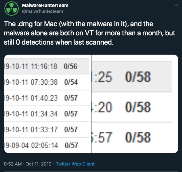 De acordo com o serviço de pesquisa de segurança VirusTotal, apenas 19 dos 72 aplicativos antivírus para Mac OS podem detectar o malware.