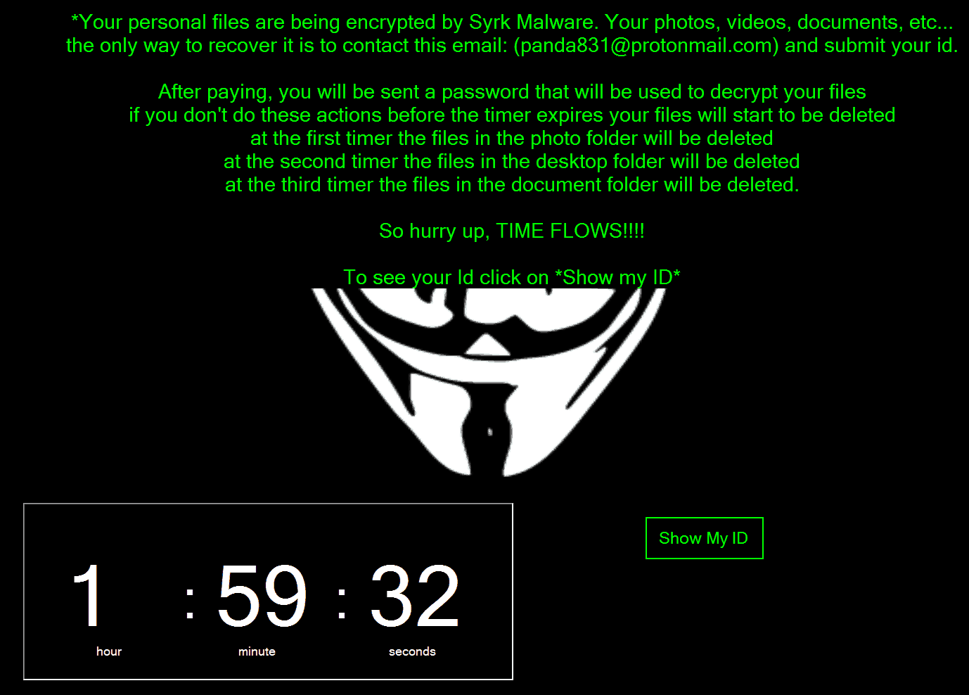 O Syrk engana os jogadores fazendo-se passar por um aplicativo falso do Fortnite. Ele geralmente aparece como “SydneyFortniteHacks.exe” e, quando executado, o aplicativo começa a criptografar arquivos no disco rígido e nas unidades USB do usuário. Se um resgate em criptomoedas não for pago, o aplicativo começa a excluir uma pasta após a outra, até apagar todos os arquivos.