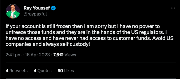 De acordo com o fundador da Paxful, 3% dos fundos totais dos clientes ainda estão congelados, resultando em cerca de US$ 4,4 milhões em fundos congelados na plataforma. Mas Youssef destacou que nem ele nem a Paxful possuem o controle das carteiras onde estão os fundos.