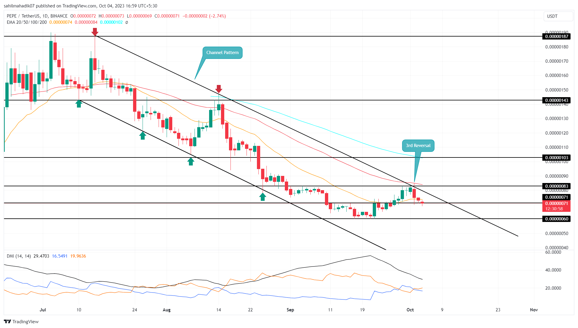 A recuperação testemunhada pelo preço da memecoin Pepecoin (PEPE) no final de setembro encontrou um obstáculo significativo. De acordo com o TradingView, o preço não conseguiu romper o nível de resistência duplo de US$ 0,00000083 e da linha de tendência superior de um padrão de canal estabelecido.