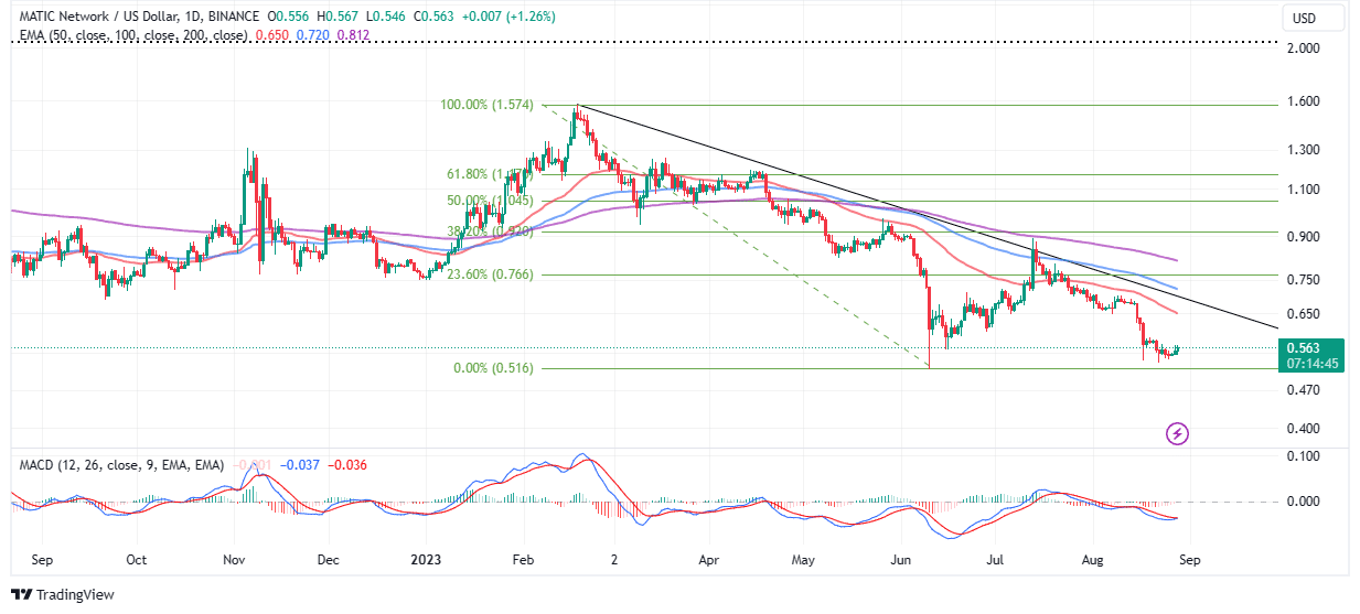 Antes de acionar as ordens de compra, os traders devem considerar esperar que o preço da MATIC confirme o suporte em US$ 0,55. A primeira meta de lucro é de US$ 0,65 com a média móvel exponencial (EMA) de 50 dias (vermelho).