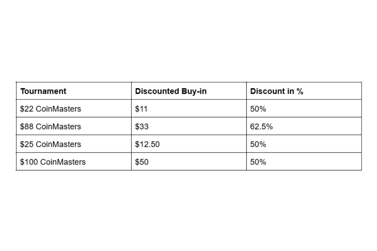 - Descontos em torneios CoinMasters: quatro torneios por dia terão descontos de 50% a 62,5% no buy-in — mantendo as mesmas premiações garantidas.