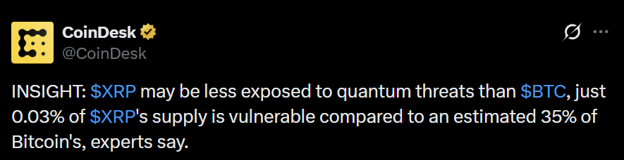 Uma análise recente da CoinDesk gerou discussões em todo o espaço cripto. Especialistas estimam que apenas 0,03% do fornecimento total de XRP é vulnerável a ataques quânticos, comparado a impressionantes 35% do Bitcoin. À primeira vista, isso parece uma boa notícia para os detentores de XRP. Mas a realidade é mais complexa.