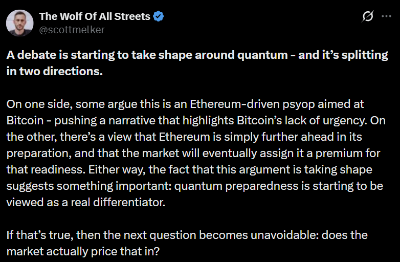 Existe um debate em andamento sobre o risco quântico, e The Wolf Of All Streets postou uma longa thread no X analisando a questão. A discussão se divide em duas direções. Alguns dizem que é uma operação psicológica impulsionada pelo Ethereum visando o Bitcoin. Outros acreditam que o Ethereum está simplesmente mais à frente em preparação.
