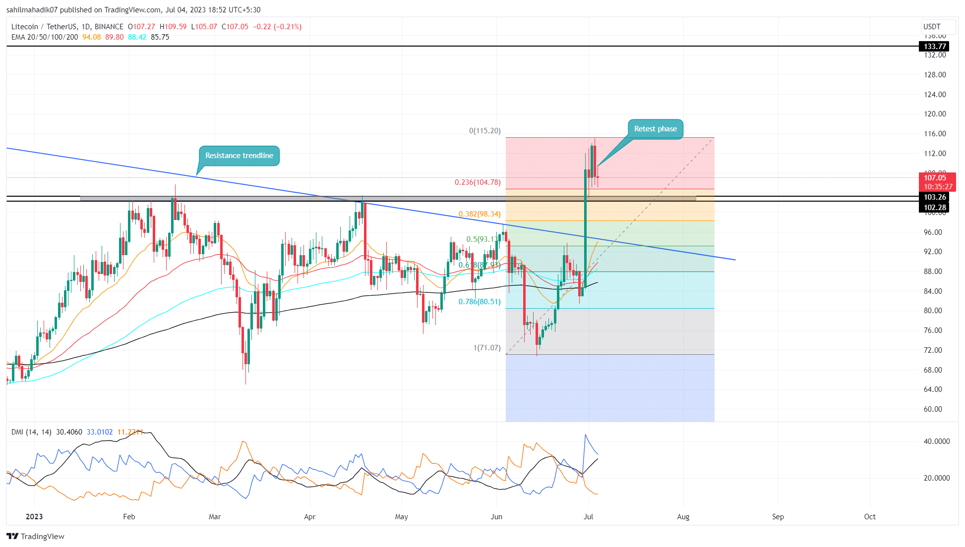 Nos últimos quatro dias, o preço da LTC tem oscilado acima da barreira recentemente quebrada de US$ 103,20. De acordo com o gráfico abaixo, o objetivo da oscilação é testar esse nível novamente como um suporte em potencial. Essa retração é uma fase essencial após uma recuperação massiva, pois permite a recuperação do momento de alta e valida a estabilidade de preços em níveis mais altos.