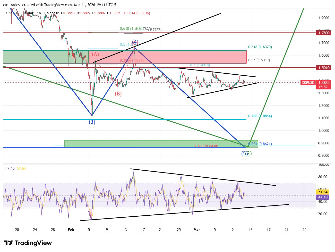 O gráfico compartilhado mostra o XRP negociado a US$ 1,3835, com níveis importantes destacados. Dois níveis críticos de retração de Fibonacci se destacam: 0,618 em US$ 1,6370 e 0,786 em US$ 0,8621.