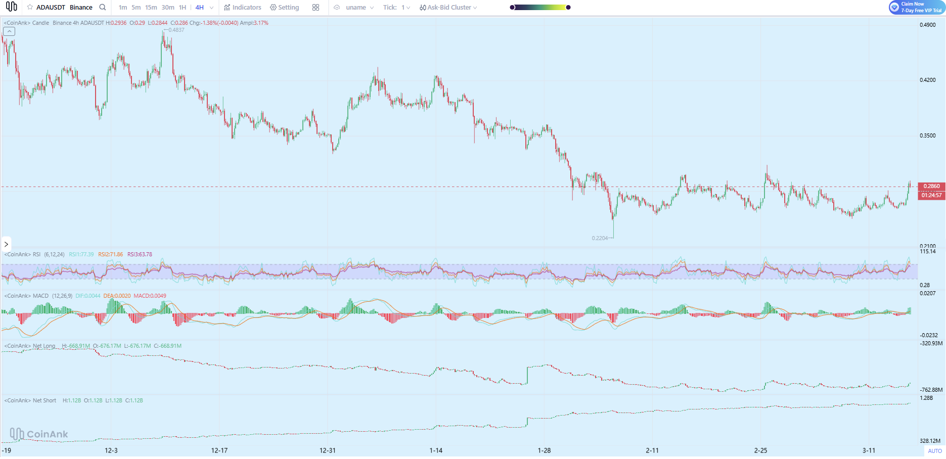 O suporte está em US$ 0,2860. Se esse nível romper, o próximo piso aparece próximo de US$ 0,23, mínima registrada em dezembro. As resistências estão em US$ 0,35 e depois em US$ 0,42. A previsão de preço do ADA, com base nesse cenário, aponta para mais quedas antes de qualquer recuperação consistente. Os compradores não defendem o nível atual com convicção. Os vendedores seguem no controle.