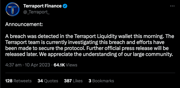 “Detectamos uma violação na carteira da Terraport Liquidity esta manhã. A equipe da Terraport está investigando essa violação e esforços foram feitos para proteger o protocolo. Divulgaremos um comunicado oficial à imprensa mais tarde. Agradecemos a compreensão”, disse a DEX.