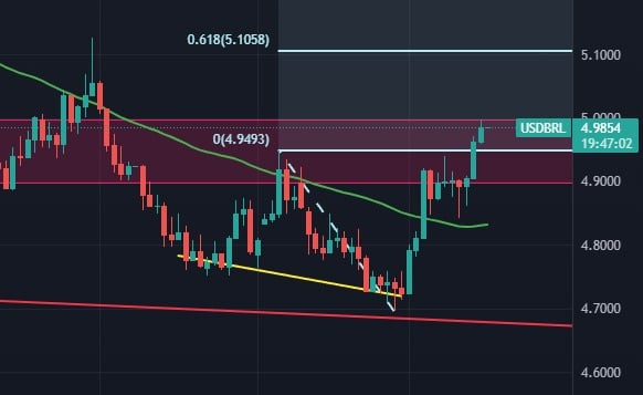 “O movimento de pivô de alta, configurado no gráfico do dólar, deve resultar em uma alta até R$5,10. Dólar subindo geralmente significa bitcoin desvalorizando. A região de US$25.600 é meu alvo para a principal moeda do mercado nas próximas semanas”, disse Pereira.