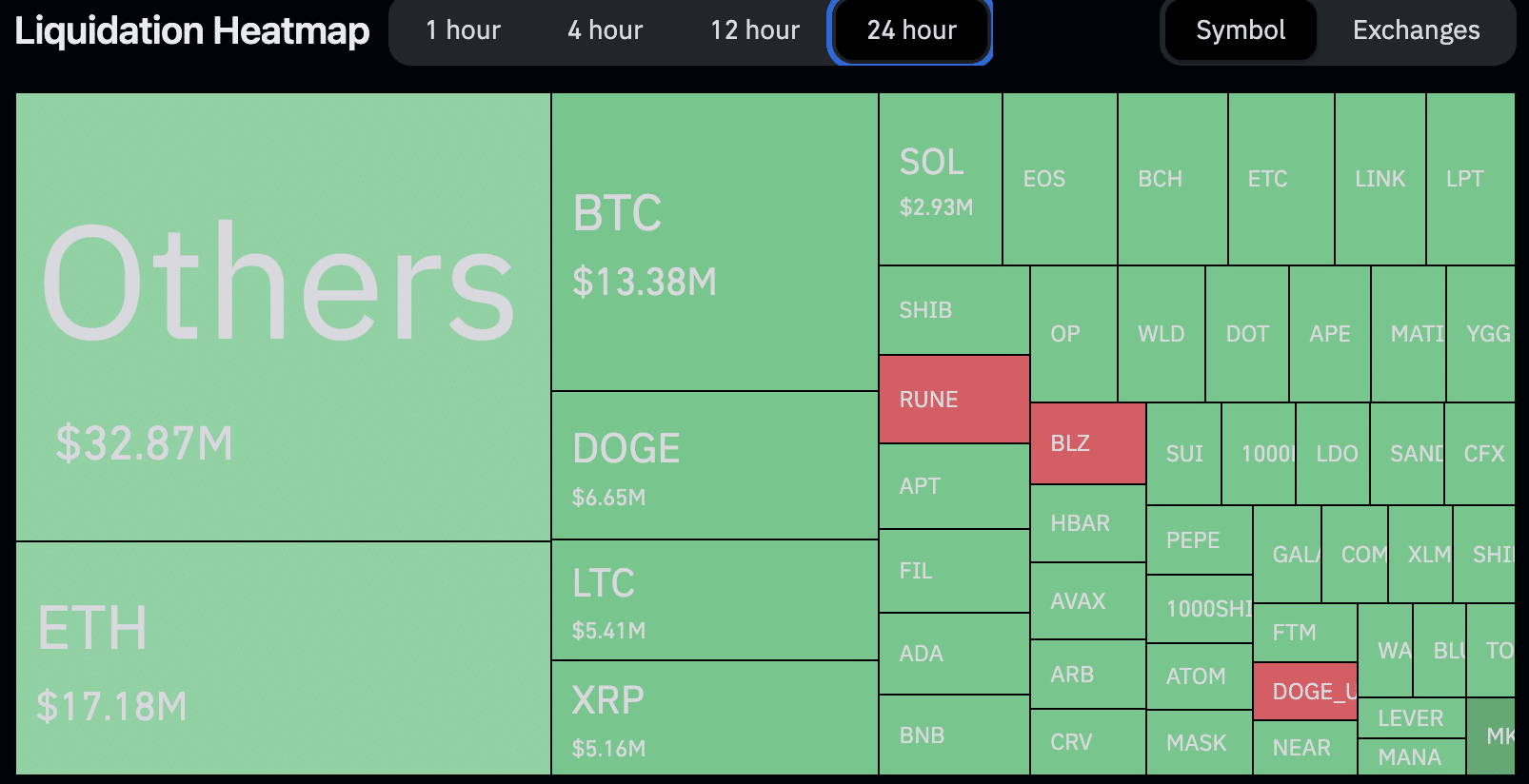Tanto os volumes de futuros e as liquidações de criptomoedas registraram ganhos nas últimas 24 horas, conforme mostram os dados do Coinglass. Nos futuros, o volume registrou alta de 20% e chegou a US$ 54,9 bilhões, com a Binance movimentando US$ 7,42 bilhões. A Bitget movimentou US$ 2,42 bilhões e a OKX veio em seguida, com US$ 2,56 bilhões.