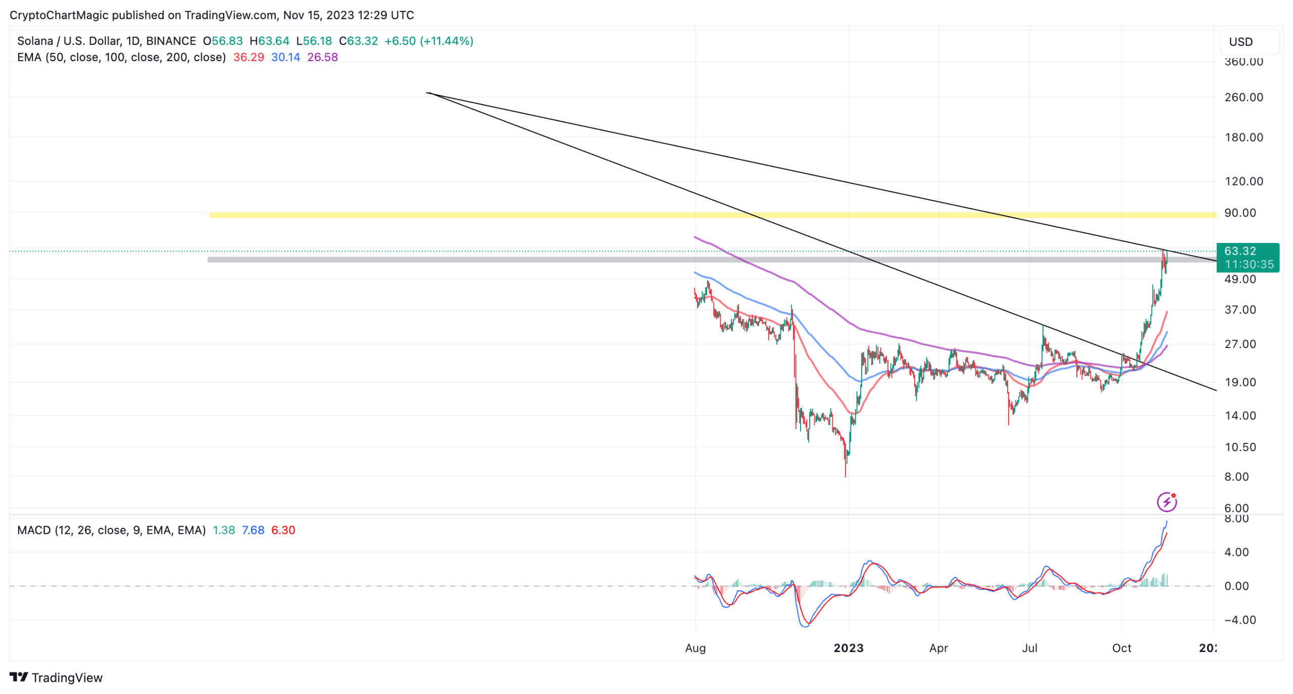 Enquanto a SOL mostra força nos gráficos técnicos, o próximo preço-alvo imediato da Solana é de US$ 70 e, posteriormente, de US$ 100. Esta perspectiva otimista tem o apoio pela ocorrência de duas cruzes douradas, significando casos em que a média móvel exponencial (EMA) de 50 dias (vermelho) cruzou acima da EMA de 100 dias (azul) e da EMA de 200 dias (roxo).