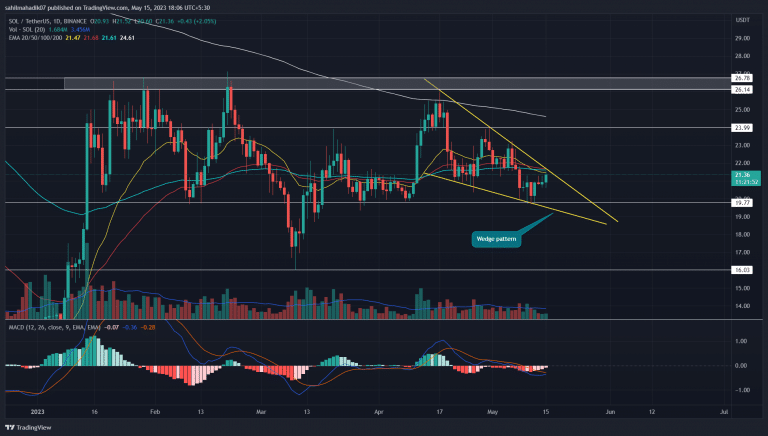 De fato, o preço da Solana se recuperou da linha de tendência de suporte do padrão várias vezes, refletindo o respeito do trader por essa configuração e uma maior possibilidade de atingir seu alvo potencial.
