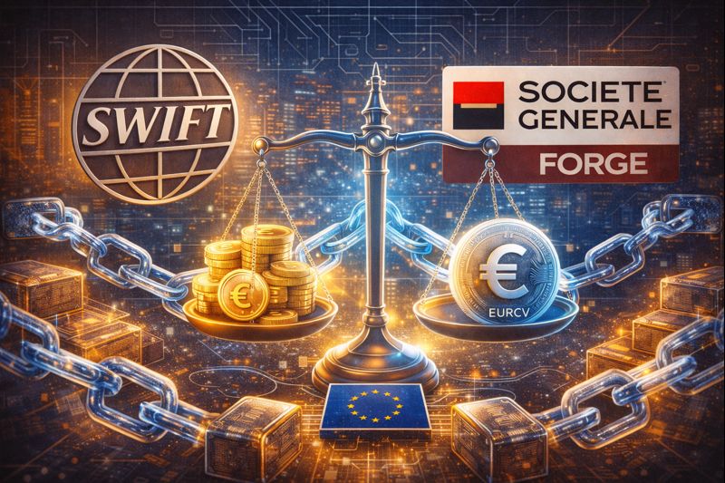 Em termos simples, a SWIFT coordenou a liquidação “delivery versus payment” (DvP) de títulos tokenizados, garantindo que o ativo e o pagamento em stablecoin fossem trocados simultaneamente. A Société Générale–FORGE utilizou a EURCV, uma stablecoin em euros classificada como token de dinheiro eletrônico sob o regime MiCA da União Europeia.
