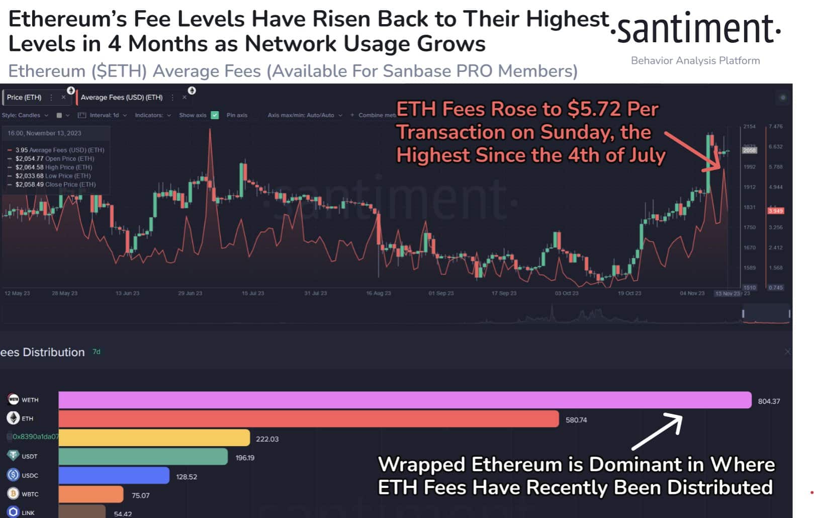 No início desta semana, precisamente no dia 12 de novembro, as taxas da rede Ethereum subiram para US$ 5,72 por transação, atingindo seus níveis mais altos desde julho de 2023. Além disso, conforme aponta o gráfico da Santiment, as taxas seguem uma forte tendência de alta desde outubro.
