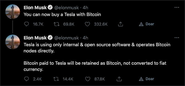 De acordo com Musk, a empresa irá acumular os Bitcoins obtidos na venda de seus carros. Ele também anunciou que a Tesla rodará o seu próprio nó da rede do Bitcoin.