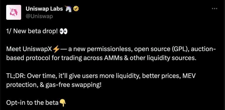 A equipe de desenvolvimento da Uniswap anunciou o lançamento de um novo protocolo beta chamado UniswapX. De acordo com os desenvolvedores, este é “um novo protocolo baseado em leilão de código aberto (GPL) sem permissão para negociação com várias fontes de liquidez”.