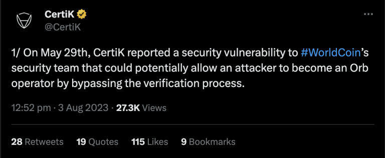 Por sua vez, a CertiK supostamente verificou e confirmou que a correção eliminou os riscos da ameaça. A empresa de segurança acrescentou que divulgará os detalhes da descoberta e também da correção feita pela Worldcoin.