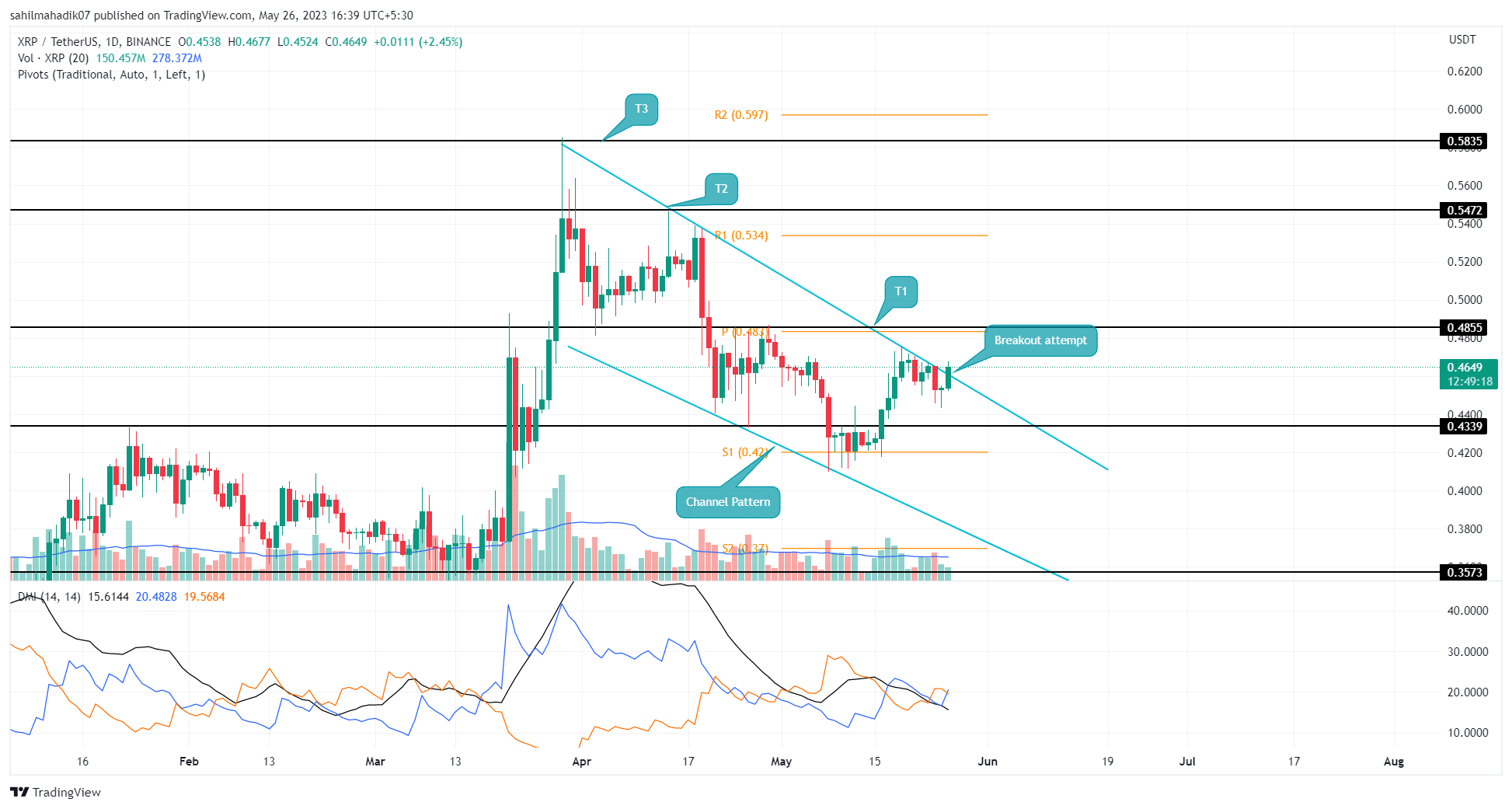 Se os compradores se mantiverem acima da linha de tendência invertida, o preço do XRP poderá sofrer um rápido salto de 5% e atingir a marca de US$ 0,5. No entanto, em teoria, cada oscilação alta na formação do padrão do canal atua como um alvo significativo.