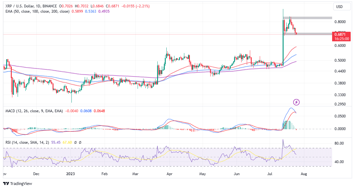 Depois que os compradores falharam em sustentar a tendência de alta desencadeada pela vitória da Ripple contra a Comissão de Valores Mobiliários dos Estados Unidos S(EC), o preço da XRP mudou de tendência. Nesse sentido, a criptomoeda caiu da máxima de US$ 0,85 e chegou ao preço atual, uma queda de 18%.