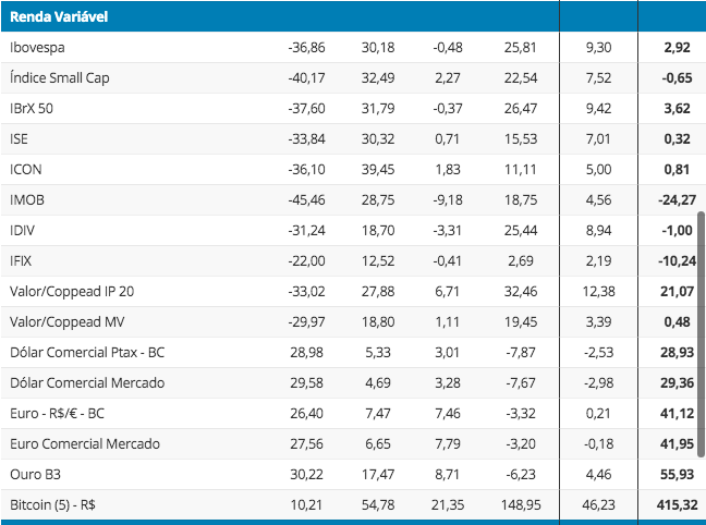 Já as ações tiveram performances bastante moderadas. O índice Ibovespa recuperou as perdas do ano, mas fechou 2020 com míseros 2,92% de alta – mais de 100 vezes menos que o Bitcoin.